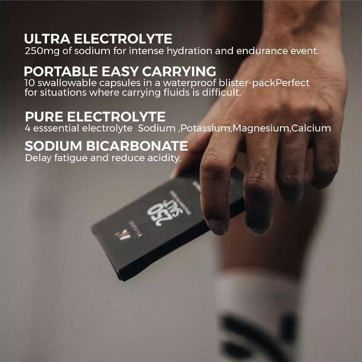250SALT+ จึงถูกออกแบบมาให้มีโซเดียมสูงถึง 250 มิลลิกรัมในเม็ดแคปซูลเม็ดเดียว เพื่อเติมเต็มความต้องการเกลือแร่ในนักกีฬาที่เผชิญกับการสูญเสียเหงื่อสูงในกิจกรรมความเข้มข้นสูงและระยะยาว สูตรนี้ช่วยให้การชดเชยโซเดียมมีประสิทธิภาพมากขึ้น ไม่ต้องทานและพกหลายเม็ด ทานและดื่มน้ำตามได้ทันที