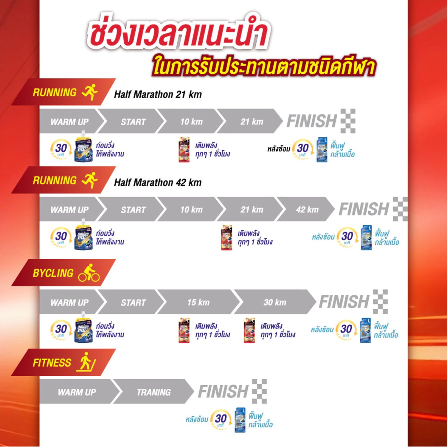 - พลังงาน 120 Kcal: ช่วยเป็นเชื้อเพลิงพร้อมใช้สำหรับการฝึกซ้อมหรือการแข่งขัน