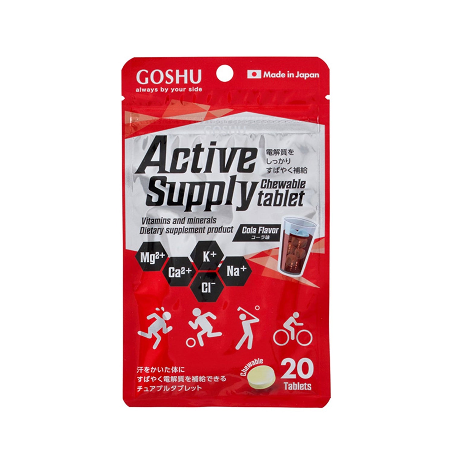 GOSHU Active Supply เกลือแร่เม็ดเคี้ยวจากญี่ปุ่น (Made in Japan)สำหรับนักวิ่ง นักปั่น และผู้ที่ออกกำลังกายหนักโดยเฉพาะ ไม่ต้องชง ไม่ต้องรอ แค่ เคี้ยวก็เติมเต็มอิเล็กโทรไลต์ที่สูญเสียไปกับเหงื่อได้อย่างรวดเร็ว ช่วยรักษาสมดุลของร่างกายและกล้ามเนื้อ ให้คุณไปต่อได้ตลอดเส้นทาง